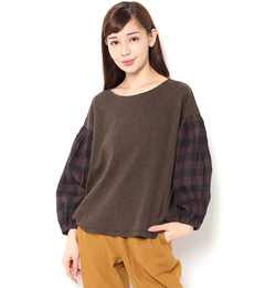 【送料無料】 チェック地に切り替えたふっくらとした異素材スリーブが愛らしさをプラスする、大人レディなプルオーバー。ドロップショルダーのゆるシルエットで気になるラインを拾わず、華奢な印象に見せてくれる嬉しい効果も◎落ち着いた色合いでコーディネートに取り入れやすく、カジュアルからフェミニンにと幅広く活躍してくれるアイテムです。 サマンサモスモス/Samansa Mos2 トップス|Tシャツ・カットソー